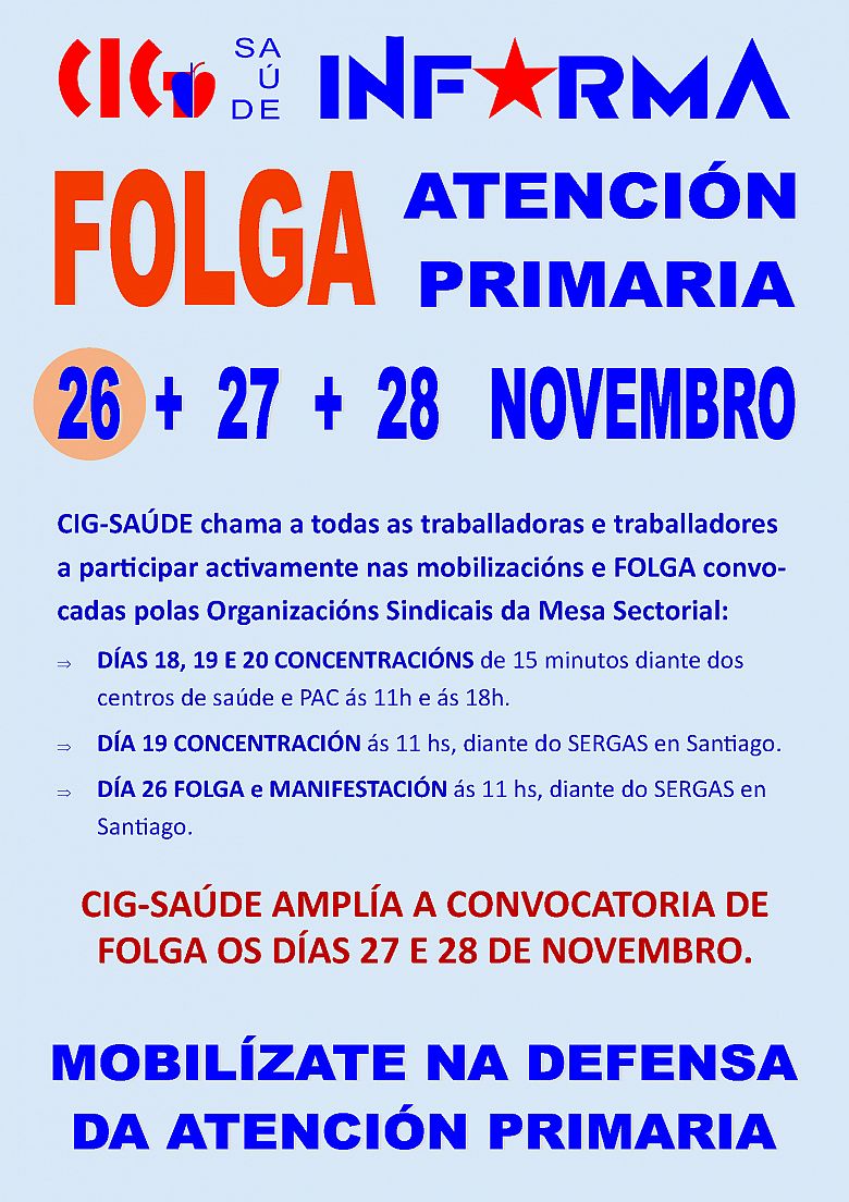 CIG-Saúde mantén a convocatoria de folga e mobilizacións do día 26, conxuntas coas organizacións sindicais con representación na Mesa Sectorial, e despois de escoitar a súa afiliación, decide ampliar a convocatoria de folga para todas as persoas que traballan na Atención Primaria aos días 27 e 28 de novembro.