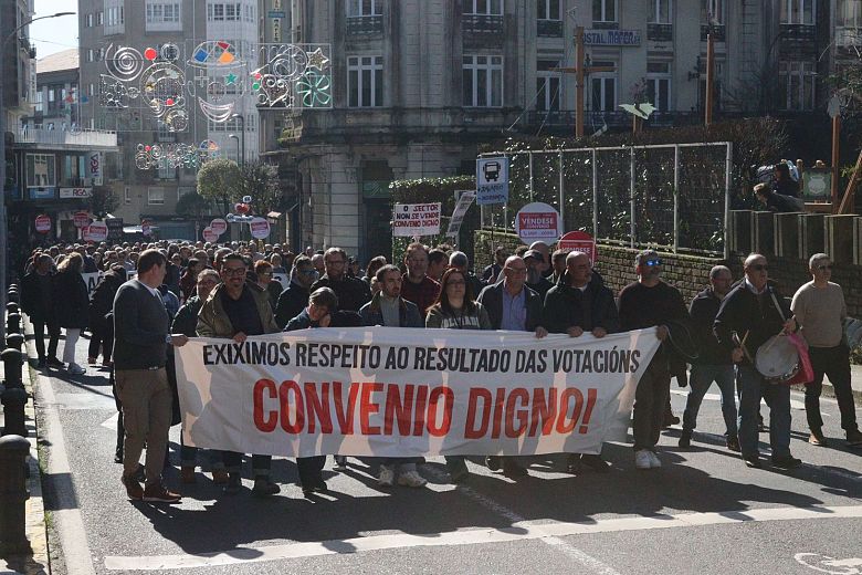 A manifestación, que partiu da estación intermodal de Santiago e rematou na Praza do Toural, estivo encabezada por unha faixa cunha mensaxe clara dirixida á patronal e aos sindicatos estatais: “exiximos respecto ao resultado das votacións, convenio digno”, en referencia ao rotundo rexeitamento do acordo asinado no marco da mediación, que recibiu a oposición de 831 persoas traballadoras no referendo celebrado o 4 de febreiro. Un referendo que, hai que salientar, era vinculante para todas as partes.